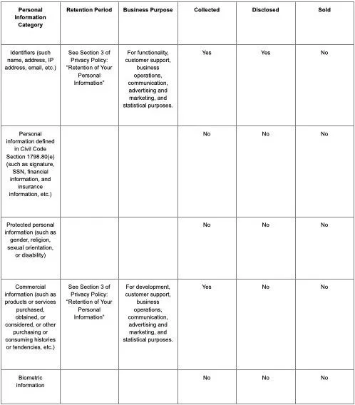 The categories of Personal Information collected, disclosed, and sold from California residents over the preceding 12 months and Ratio Verum’s applicable retention periods include: